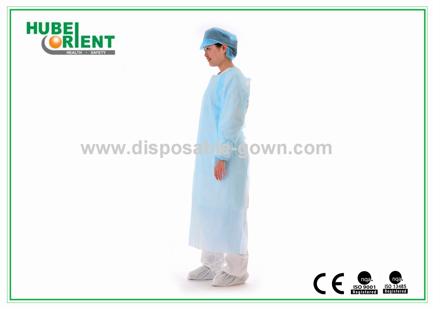 35-65 กรัม กันเหลว ชุดป้องกัน CPE ครั้งเดียว พร้อมผ้าพันคอนิ้วมือสําหรับโรงพยาบาล