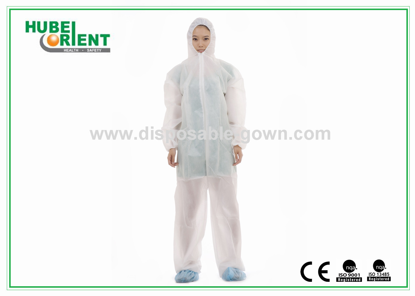 ชุดปกป้องสีขาว ไม่เนื้อผ้า/SMS/PP+PE ชุดปกปิดใช้ครั้งเดียว พร้อมหมวกและรัดล็อปสําหรับห้องปฏิบัติการ